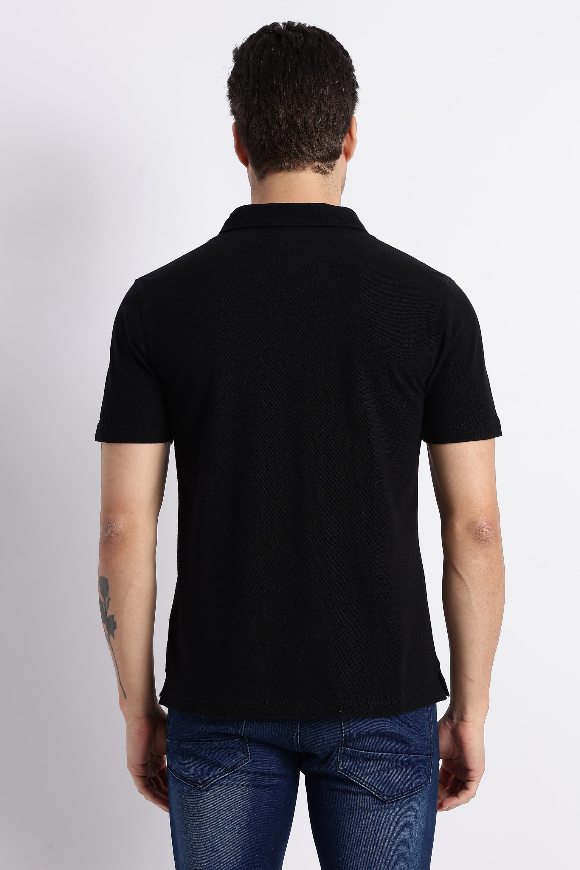 Men Solid Black Cotton Polo with Embroidered Logo and Collar Stand